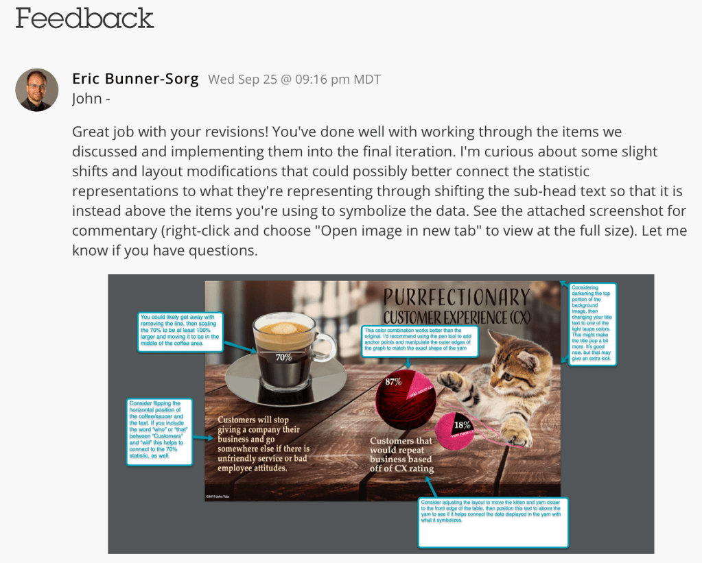Throughout this course, the most helpful things to me were not only Professor Bunner-Sorg’s openness, honesty, and availability but in particular the video feedback he provided. It gave greater insight and felt much more personal. For example, the video feedback provided for the Understanding Client Needs Draft assignment helped my project to develop and grow, subsequently enabling me to see even greater success in the final presentation.