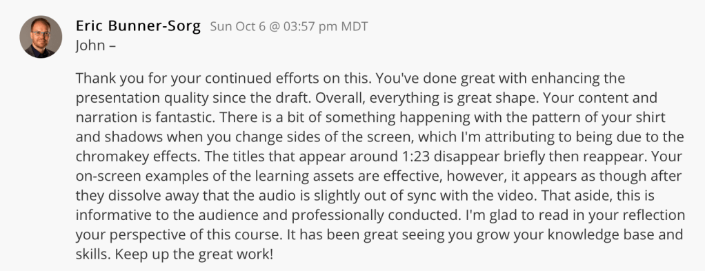 There were a few contributions that Music and Audio for Instructional Design made to my personal and professional development. Professionally, the newfound skills in audio editing have proven to be and will continue to be invaluable across the widest range of assets I develop. Whether it be producing video content, tutorials, audio, or editing client content the skills I developed will be used. Also, this class was largely self-taught on two fronts. The lack of direction forced me to be self-driven in my endeavors and if it were not for the addition of peer feedback, the entirety of the process would have had no outside assistance. Also, similar to in a few other courses, when issues arose, and I asked for assistance I was given none. I had to search across a multitude of mediums to find the solution to my problems which will prove to be a valuable skill in the future.
