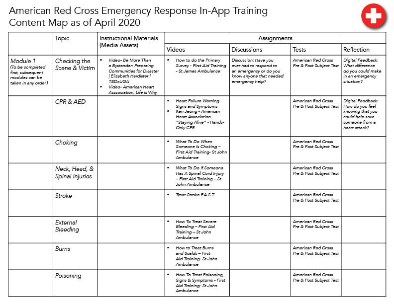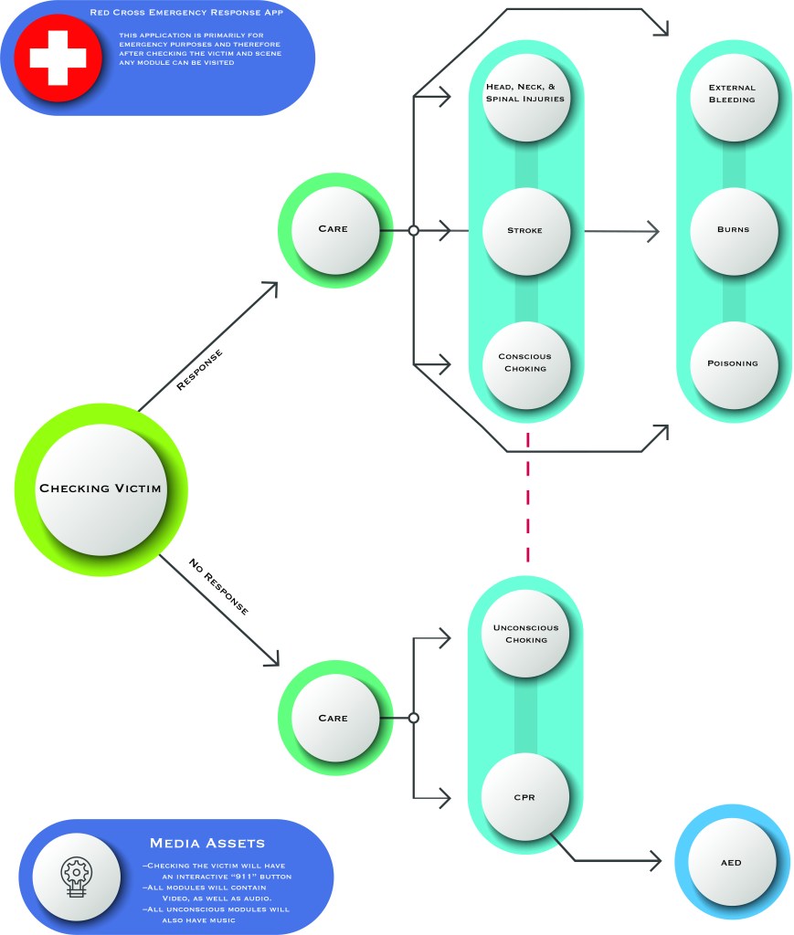 The content map that I developed is for an app based around the American Red Cross’s First Aid/CPR/AED ready reference document. The primary function of this application is to help guide anyone through an emergency situation. When designing the content map, this was taken into consideration as it alters the format of the document. Unlike trainings or courses based around the same subject matter, the information is free flowing and can be access in any order, with the exception of checking the victim and evaluating the scene. I wanted to make sure that the content map was as simple, and easy to understand as possible. Having text accompany the different modules would slow down the response time of anyone using the app for its intended purpose, therefore audio and video are the primary means of transferring information.